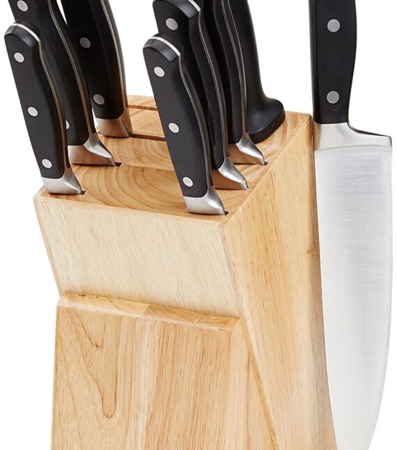 9-piece knife set includes 8-inch chef’s, 7-inch Santoku, 8-inch slicing, 8-inch bread, 6-inch boning, 5-inch utility, 3.5-inch paring, 8-inch sharpener, and wood block